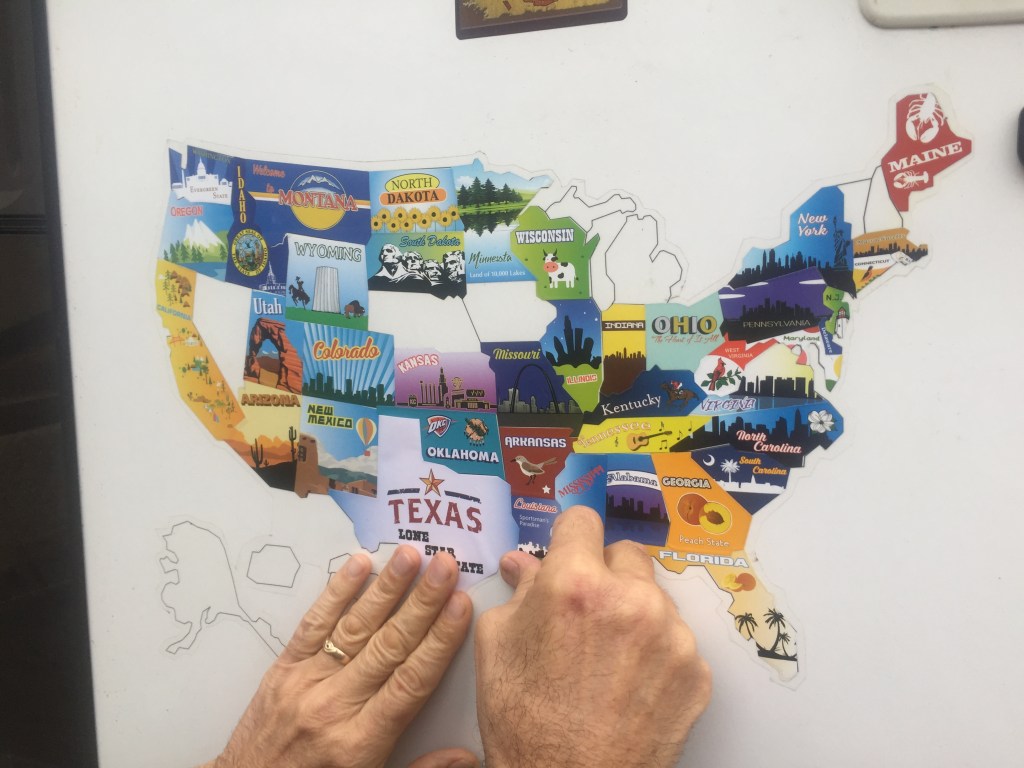 We were able to add the Texas state sticker to our map. Our rule is that we need to spend a night in the state to put the sticker on the RV. There’s no longer a large void space in the bottom.