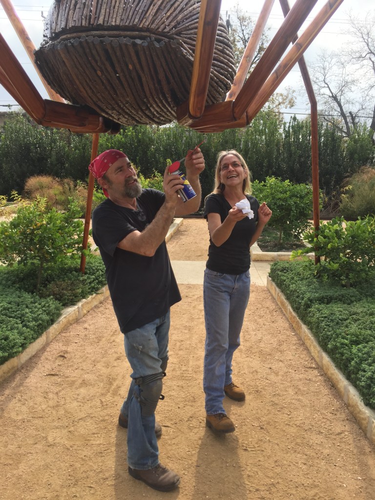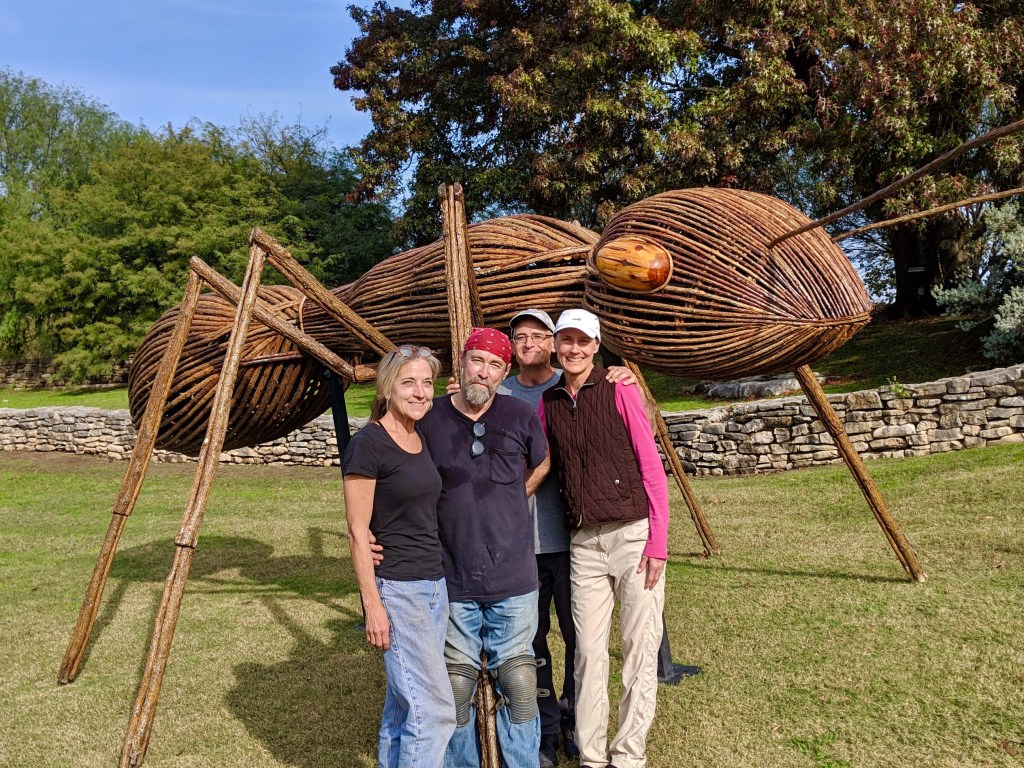 The highlight of our visit was going to the San Antonio Botanical Garden and seeing “Big Bugs” which was an art exhibit that went to Garden in the Woods when I worked there about 10 years ago. As we walked up to the first sculpture we saw two people getting ready to take down the giant insect since the exhibit finished the day before. I asked if he was the artist, David Rogers and he said “yes.” I mentioned that I worked at the Garden years ago and he actually said he remembered me! I was amazed, then he said, “your name is Lisa … Lisa Mattel.” Wow! I almost fell on the ground. OK so, he got one letter wrong but he truly remembered me from my photography. I gave him a CD of photos that I took of his Big Bug sculptures at the garden, which he continues to use for promoting his work. It was amazing to reunite, meet his partner Terri, get a ride in his golf cart, then have a group shot together under the ant sculpture. SMALL WORLD and so much fun seeing them!!!