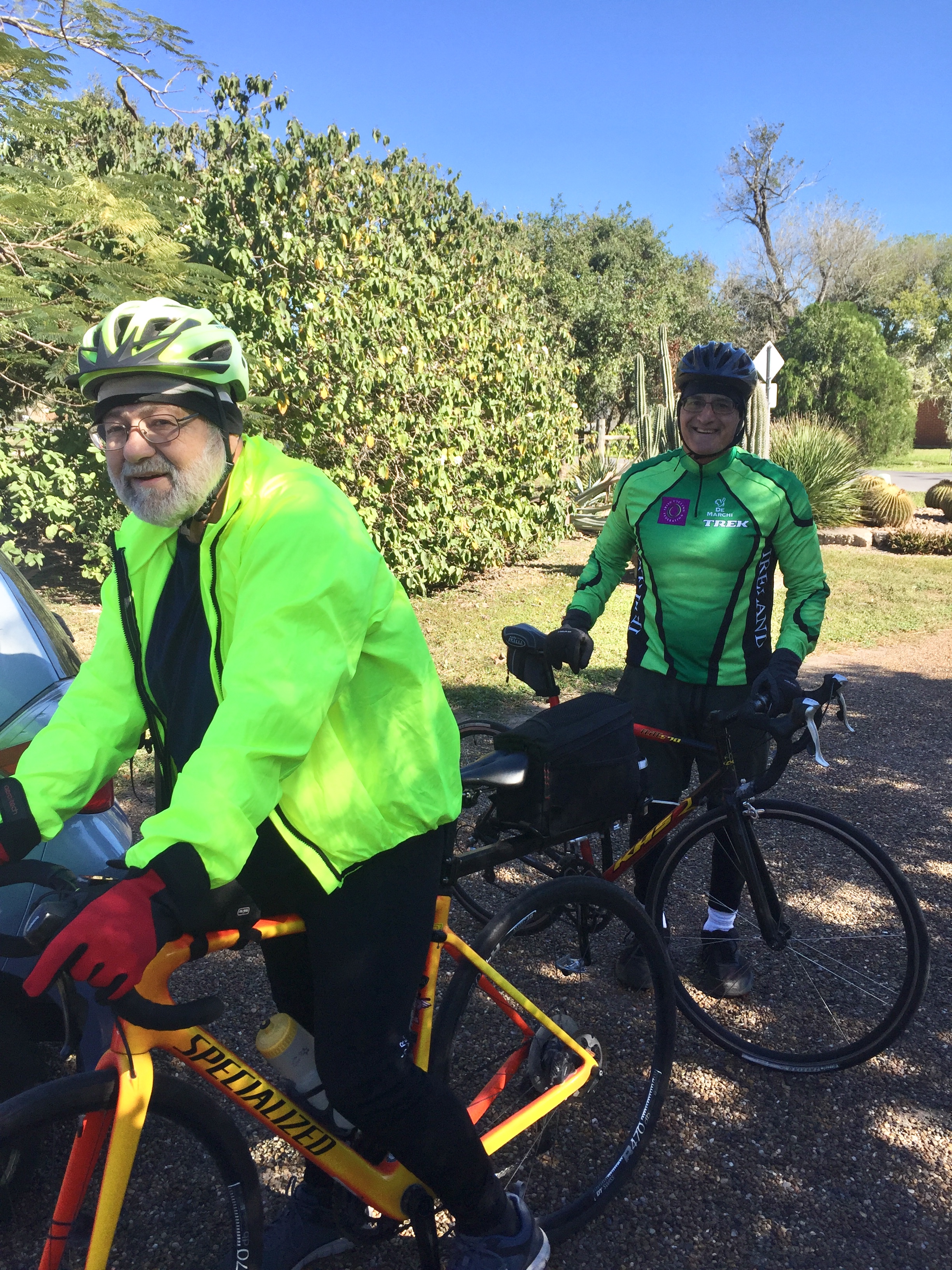 We arrived on December 10 to spend a couple of weeks with Guy and Eileen. The weather warmed up, with temps in the 70’s and 80’s with only a couple of rainy days. Guy is an excellent cook and baked bread, made pasta, pizza, baguettes, focaccia…all delicious! Together we explored an aloe farm, thrift shops, South Padre Island, and visited Mexico to get our teeth cleaned for $25. We found another disc golf course nearby and even though there weren’t many trees to get caught in, Bob managed to lose a disc when it was overthrown and rolled into the lake. Guess what he wanted for Christmas? Bob and Guy went biking a few times each week with a rewarding breakfast destination.